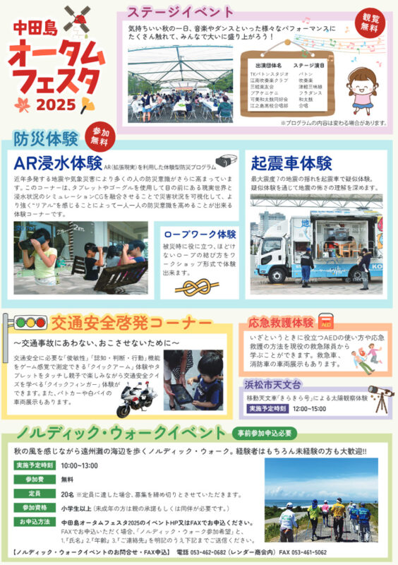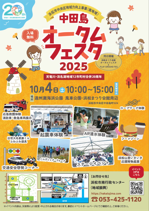 浜松市南行政センター開催の浜松市中央区地域向上事業(南地域)の『中田島オータムフェスタ2025』は、『体験』を通じて小さな子供からお年寄りまで幅広い世代の方々に楽しんでいただけるイベントです。