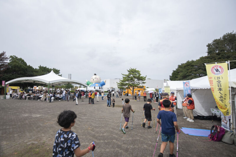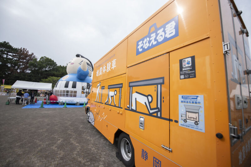 イベント内ではキッチンカーが並ぶフードゾーンがあったり、防災を体験しながら学べるコーナーとして「AR浸水体験」「起震車体験」も。ノルディック・ウォークイベント、巨大な家康くんふわふわもあったり、朝から雨模様ではありましたがそれほど大降りにはならず、お子さんも思いっきり外で楽しめるイベントとなりました。