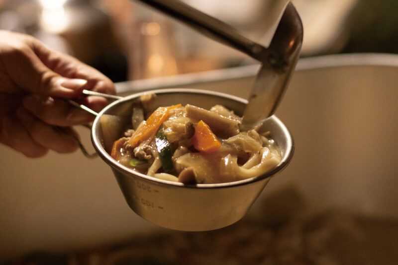 同時開催の「防災キャンプ in 中田島 [風車公園]」にて、炊き出し訓練でとん汁うどんを作っています。不特定多数の方に温かい食べ物を提供する訓練となっておりますので、ぜひ、「食べる」ことでご参加ください。